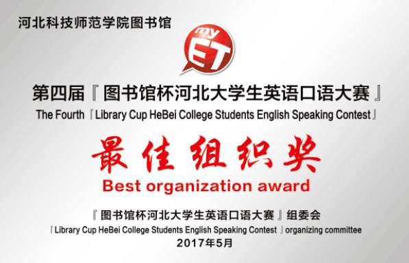第四届“图书馆杯”河北省大学生英语口语大赛于2017年4月18日至5月8日举行,best365图书馆荣获最佳组织奖。