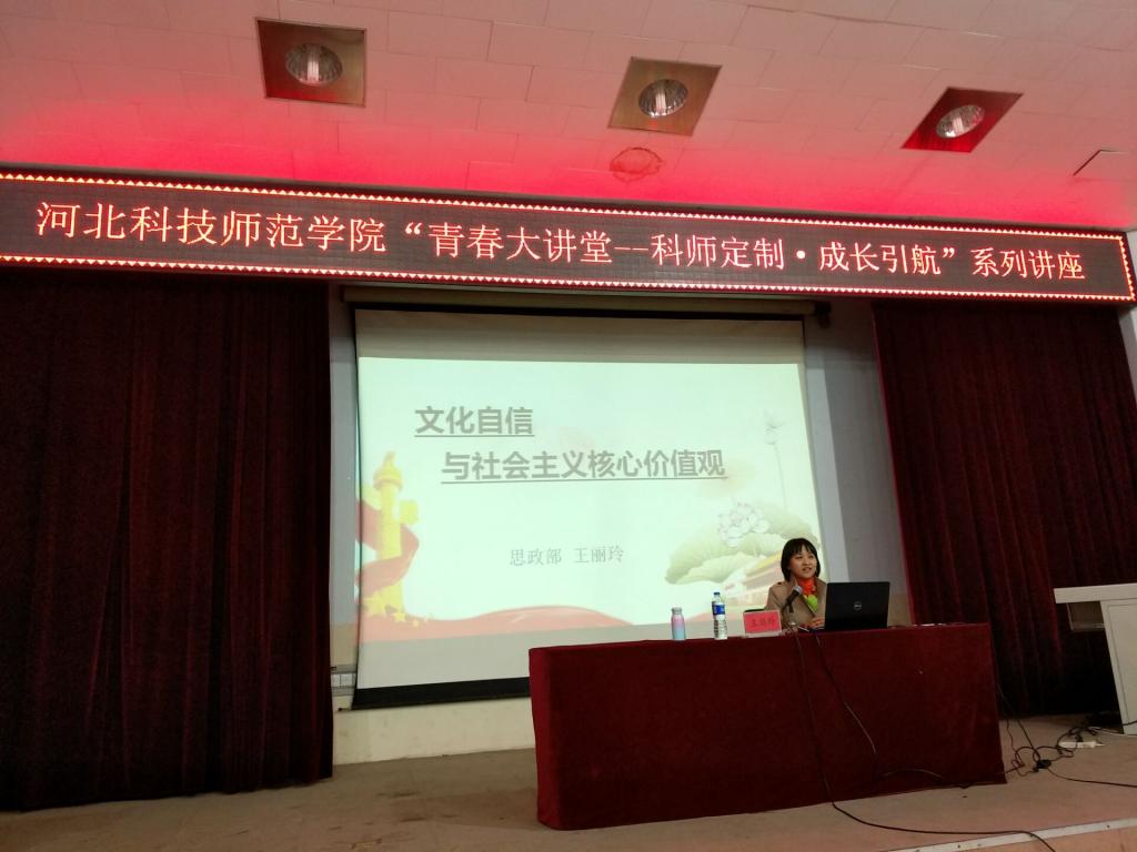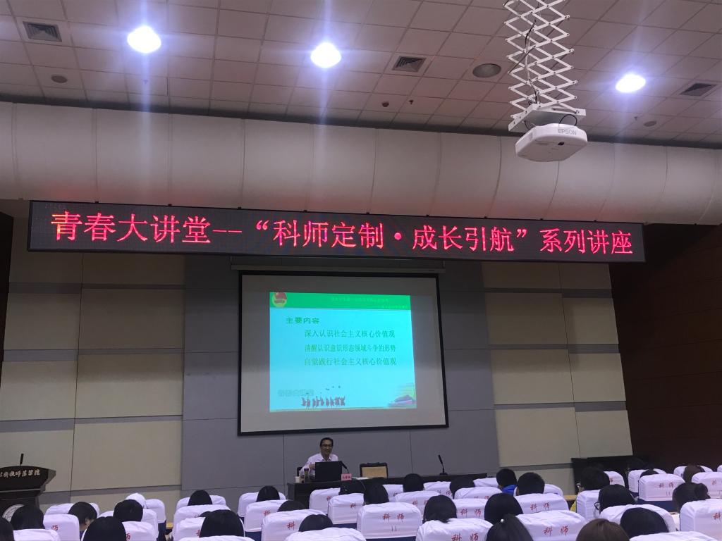 4月—5月初,由党委学工部、校团委主办的“青春大讲堂—科师定制˙成长引航”社会主义核心价值观类主题讲座分别在三个校区开展,best365思政部马爱林、李建忠、王丽玲、王炳义四位老师分别以《从意识形态角度谈社会主义核心价值观》、《牢记使命,做社会主义核心价值观的践行者和引领者》、《文化自信与社会主义核心价值观》、《践行社会主义核心价值观做当代合格大学生》为主题开展了共计12场宣讲活动,全校共有4100余名学生聆听了讲座。