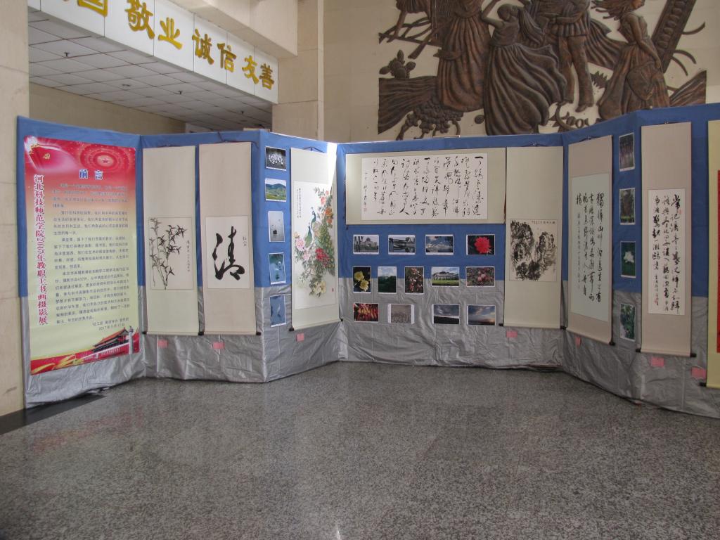 一年一度的教职工书画摄影展于2017年9月17日在逸夫楼门厅展出,本次展览收到教职工书法绘画作品81幅,展出76幅,收教职工摄影作品432幅,展出优秀作品180幅,书法作品篆、隶、行、草多种书体俱全,绘画作品工笔、写意、油画、计算机绘画各俱特色,摄影作品风景、人物、动物、植物类型齐全。所有作品全是近一年来的新作,一幅幅来自教职工亲手创作的作品,装裱精美,画面生动,扣人心弦。