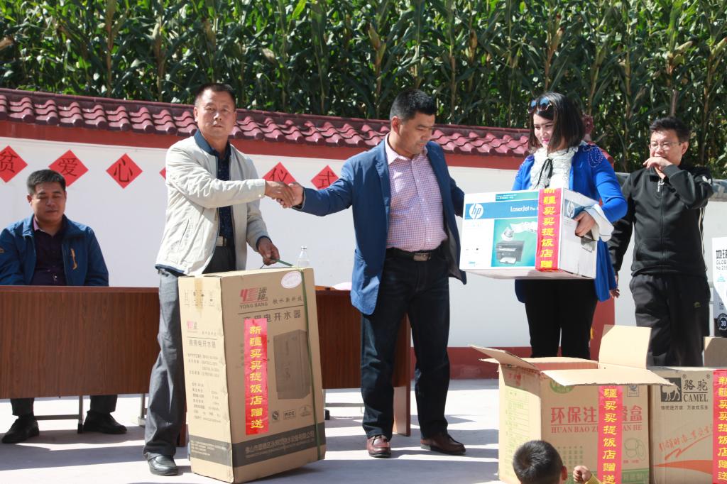 捐赠仪式上,艾合麦提·伍舒尔为村委会捐赠了崭新的电脑、打印机、热水器等,改善了村委会的办公条件;为当地学校捐赠了地球仪等大批教学仪器和热水器、微波炉等,给孩子们送去了书包、书本、文具等学生用品,为师生带去了温暖;为当地10户贫困家庭赠送了米、面、油等生活物资,帮助他们改善生活条件。