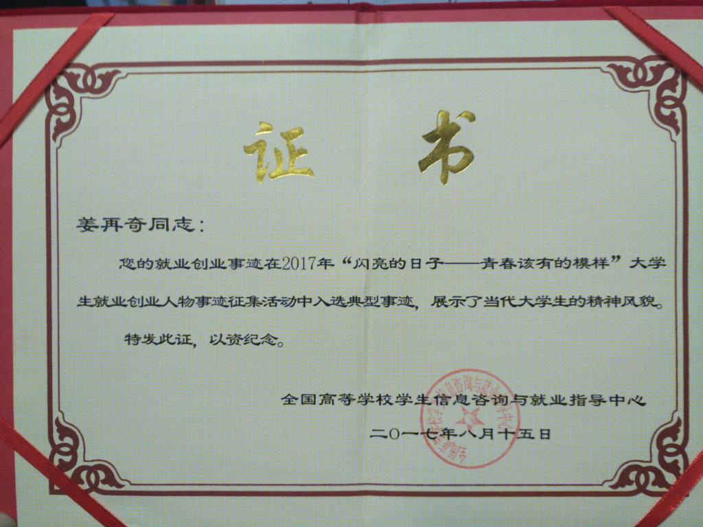 日前,教育部公布“闪亮的日子——青春该有的模样”大学生就业创业人物事迹征集活动最终获选名单,共有160名毕业生就业事迹最终入选全国就业创业事迹宣传名单,其中河北省有5名毕业生事迹入选。best3652016届物理学专业毕业生姜再奇基层就业事迹成功入选。入选毕业生事迹将在教育部网站(微信公众号)、《中国大学生就业》杂志、新职业网、学信网、各省市就业指导中心网站刊登宣传。