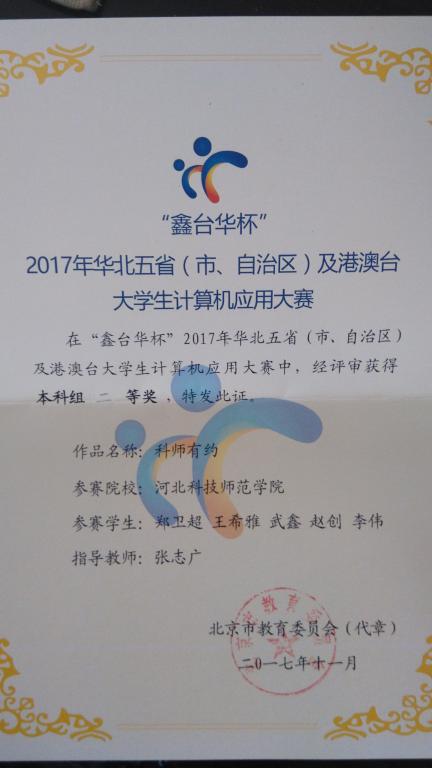 2017年11月11日,由北京、天津、河北、山西、内蒙古教育委员会联合主办的华北五省(市、自治区)及港澳台大学生计算机应用大赛总决赛在北京联合大学举办。共96支代表队入围总决赛,其中,best365数学与信息科技学院物联网专业郑卫超、王希雅、武鑫、赵创、李伟五位同学的参赛作品“科师有约”APP顺利通过河北赛区的初赛进入总决赛。在总决赛中通过答辩、演示等环节,荣获2017年华北五省大学生计算机应用大赛本科组二等奖。