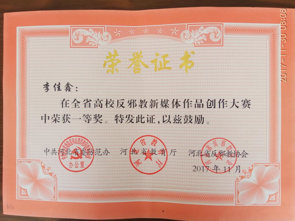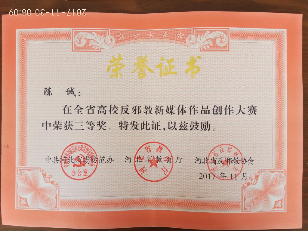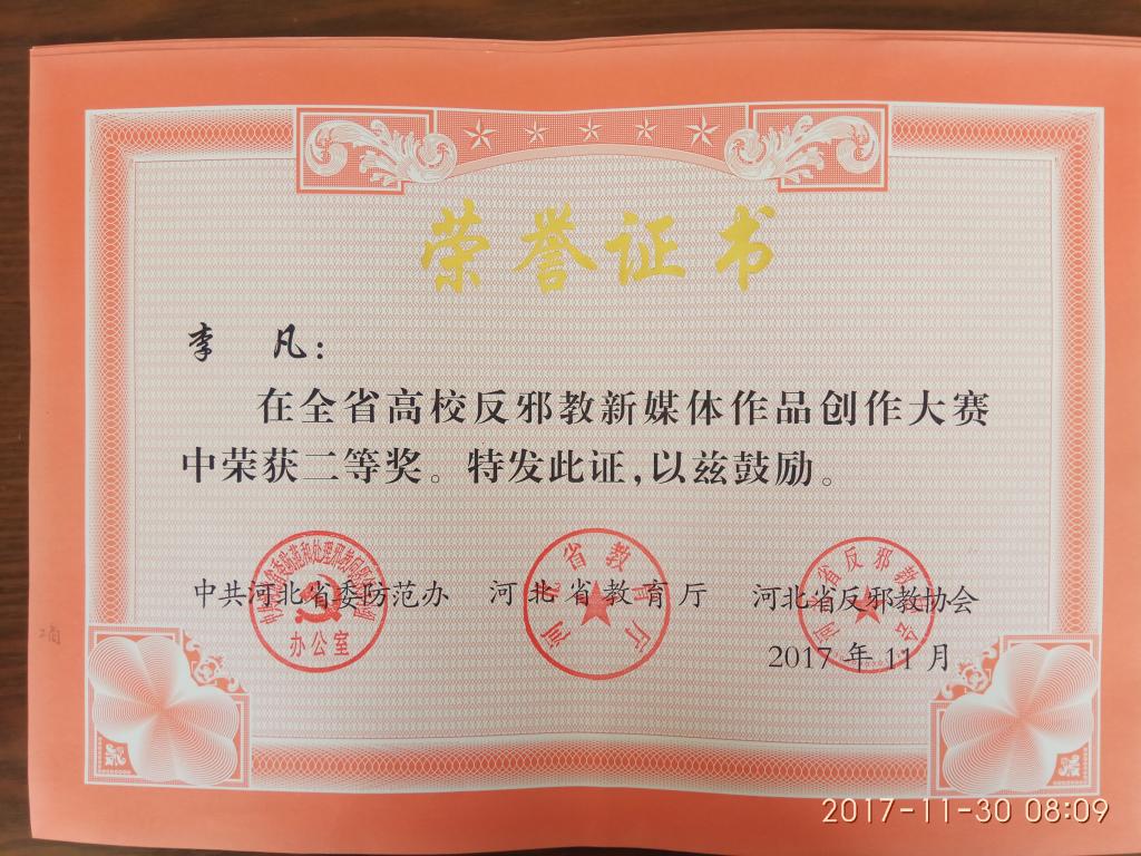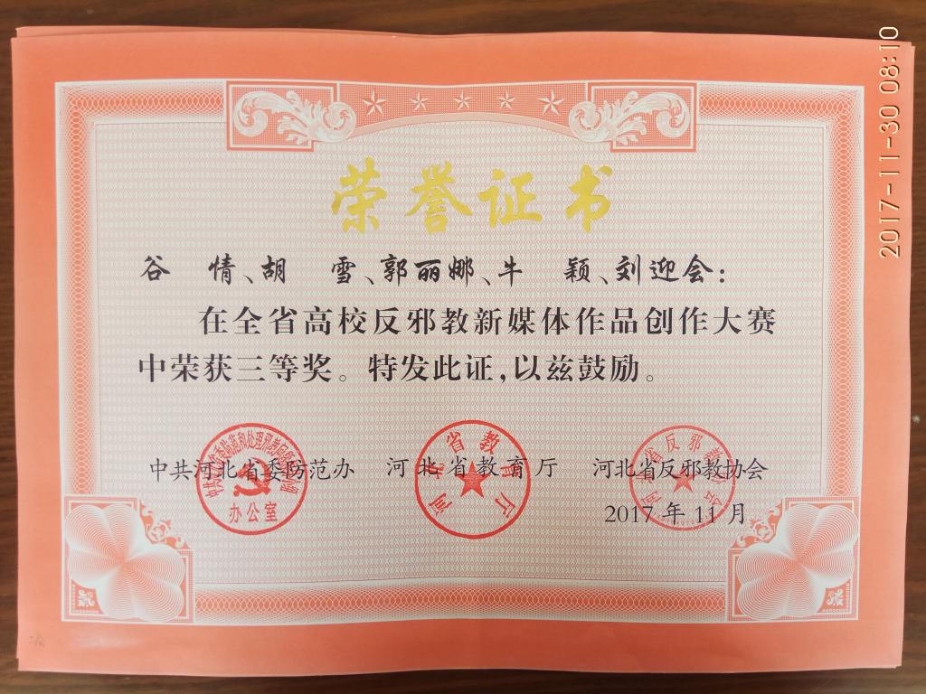 近日,河北省委防范办、河北省教育厅、河北省反邪教协会对河北省高校反邪教新媒体作品大赛获奖作品予以表彰,best365师生报送的作品获得一、二等奖各1项、三等奖2项、优秀奖4项。其中,数学与信息科技学院学生李佳鑫的作品获得一等奖;工商管理学院教师李凡的作品获得二等奖;文法学院教师陈诚、工商管理学院学生谷情的作品分别获得三等奖;食品科技学院教师王振、工商管理学院教师李鑫娜、园艺科技学院学生张亚茹、园艺科技学院学生宋子行等人的作品获得优秀奖。