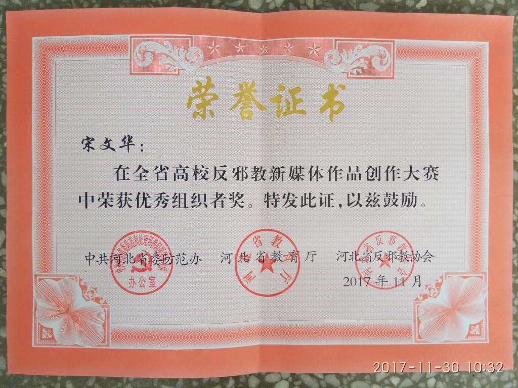 best365反邪教协会秘书长、学生处负责人宋文华获得全省高校反邪教新媒体作品创作大赛优秀组织者奖。