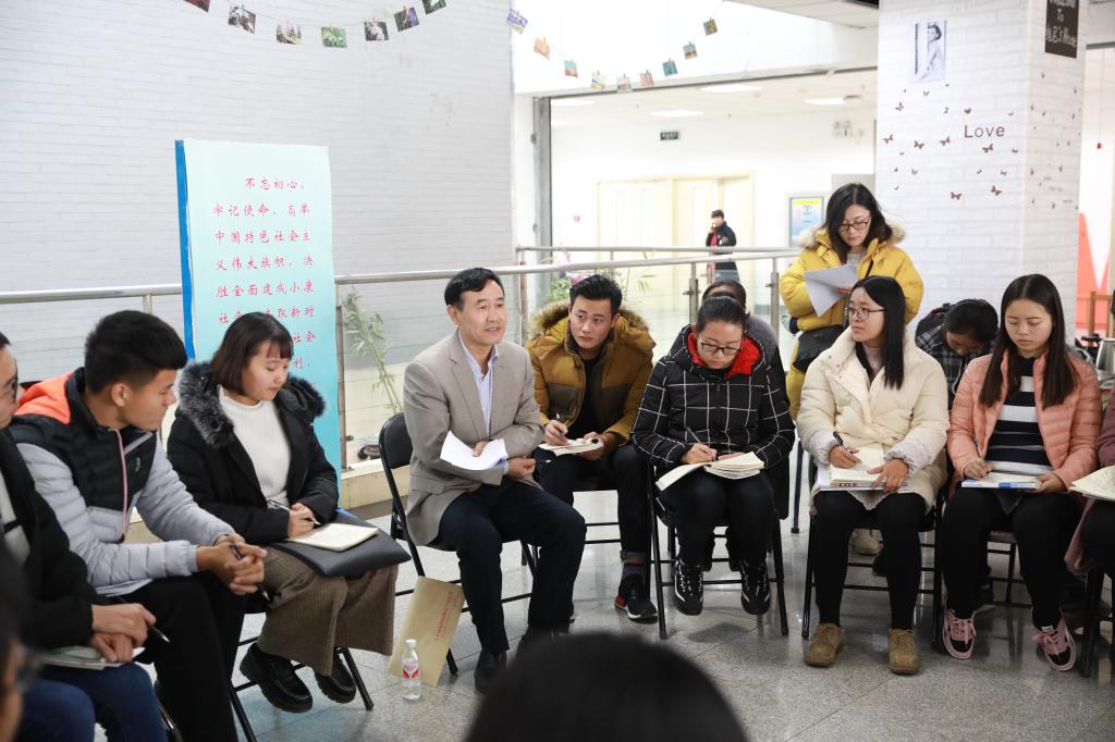 靳占忠说,十九大是一次不忘初心、牢记使命、高举旗帜、团结奋进的大会。习近平总书记对青年寄予厚望,报告中用一整段寄予青年坚定理想信念,勇做时代的弄潮儿。靳占忠首先用什么是“学习”,引发同学们的思考,并用三个词语鼓励青年大学生,要努力做到“内化于心、悟化于言、外化于行”,这样才是真正意义上的学习十九大,才能真正做十九大精神的宣传者、践行者,做中华民族伟大复兴中国梦的奋斗者、圆梦者。