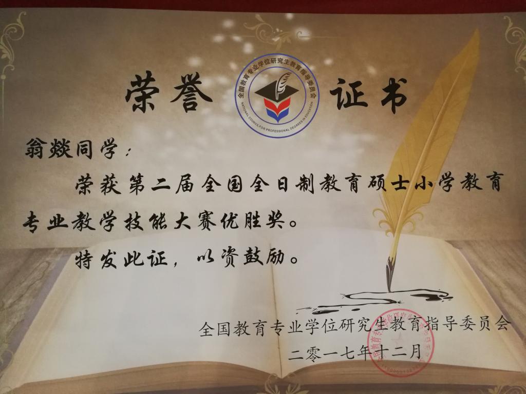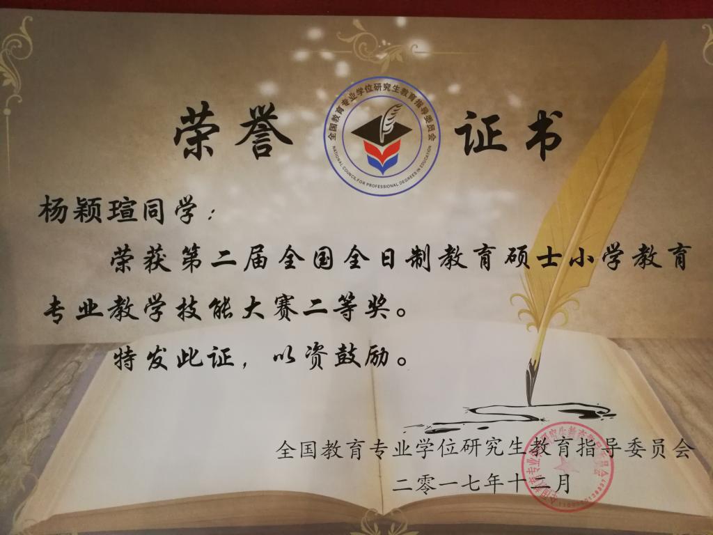 12月14日-16日,由全国教育专业学位研究生教育指导委员会主办、河北师范大学承办的全国“全日制教育硕士小学教育专业教学技能大赛(决赛)”圆满落下帷幕。决赛采用现场抽题、80分钟备课、讲课与答辩三个环节。经过激烈角逐,best365参赛选手2017级小学教育专业研究生杨颖萱获二等奖,2016级小学教育专业研究生翁燚获优胜奖。