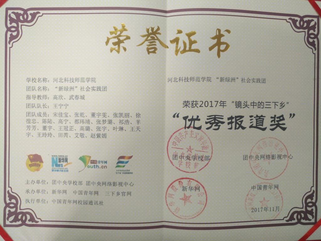 2017年12月26日,园艺科技学院师生代表一行五人应邀到北京对外经贸大学参加由团中央学校部、团中央网络影视中心主办的2017年全国大中专学生暑期社会实践总结大会。园艺科技学院“新绿洲”社会实践团获得暑期社会实践“镜头中的下乡”活动“优秀报道奖”,并在现场参加了颁奖。