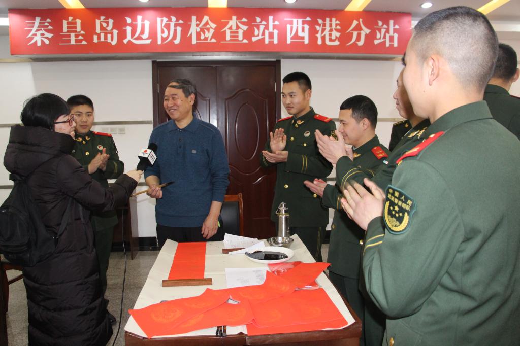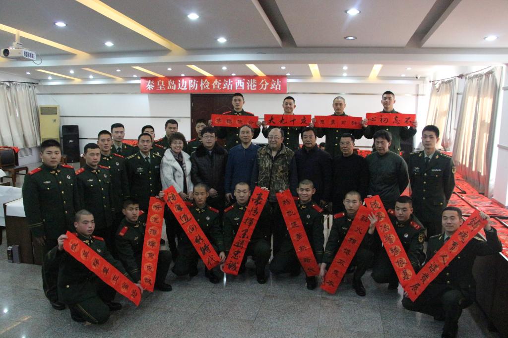 书法家们来到秦皇岛边防检查站,现场书写春联和迎春福字,用自己的专长为基层官兵们送上一份文化新春祝福。在活动现场书法艺术家们根据官兵的要求现场书写富有军营特色的迎春对联和新春福字。几位书法家笔锋翻飞转动,在官兵们的专注欣赏中,一幅幅行云流水的对联,一个个苍劲有力的福字跃然纸上。在近两个小时的活动中,书法家们共书写了春联、新春福字八十余副。其中两位书法家,年轻时就当过兵,再次走进军营感慨万千。作为艺术家以书法艺术的温暖,书道精神的热诚与感念,来到军营送春联,他们以专业之力,奉献于社会,献给秦皇岛驻地的基层官兵,使官兵们深受感动,并由衷的欢迎和感谢。