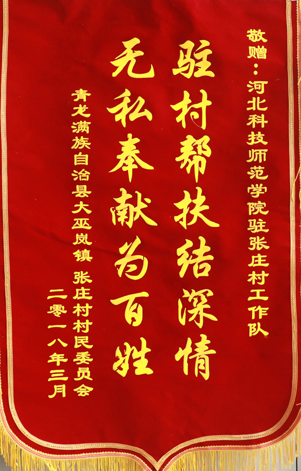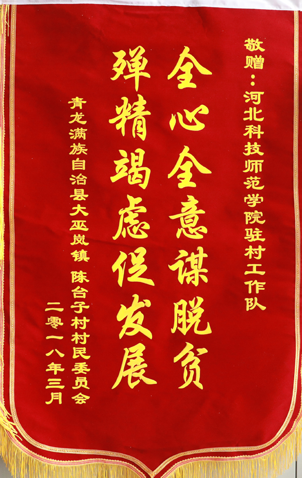 2018年3月12日,青龙满族自治县大巫岚镇陈台子村和张庄村“两委”村干部代表一行5人来到best365,将分别写有“全心全意谋脱贫 殚精竭虑促发展”和“驻村帮扶结深情 无私奉献为百姓”两面锦旗送到best365领导手中。校领导靳占忠、王同坤、李佩国以及校党委组织部负责人接受了锦旗。