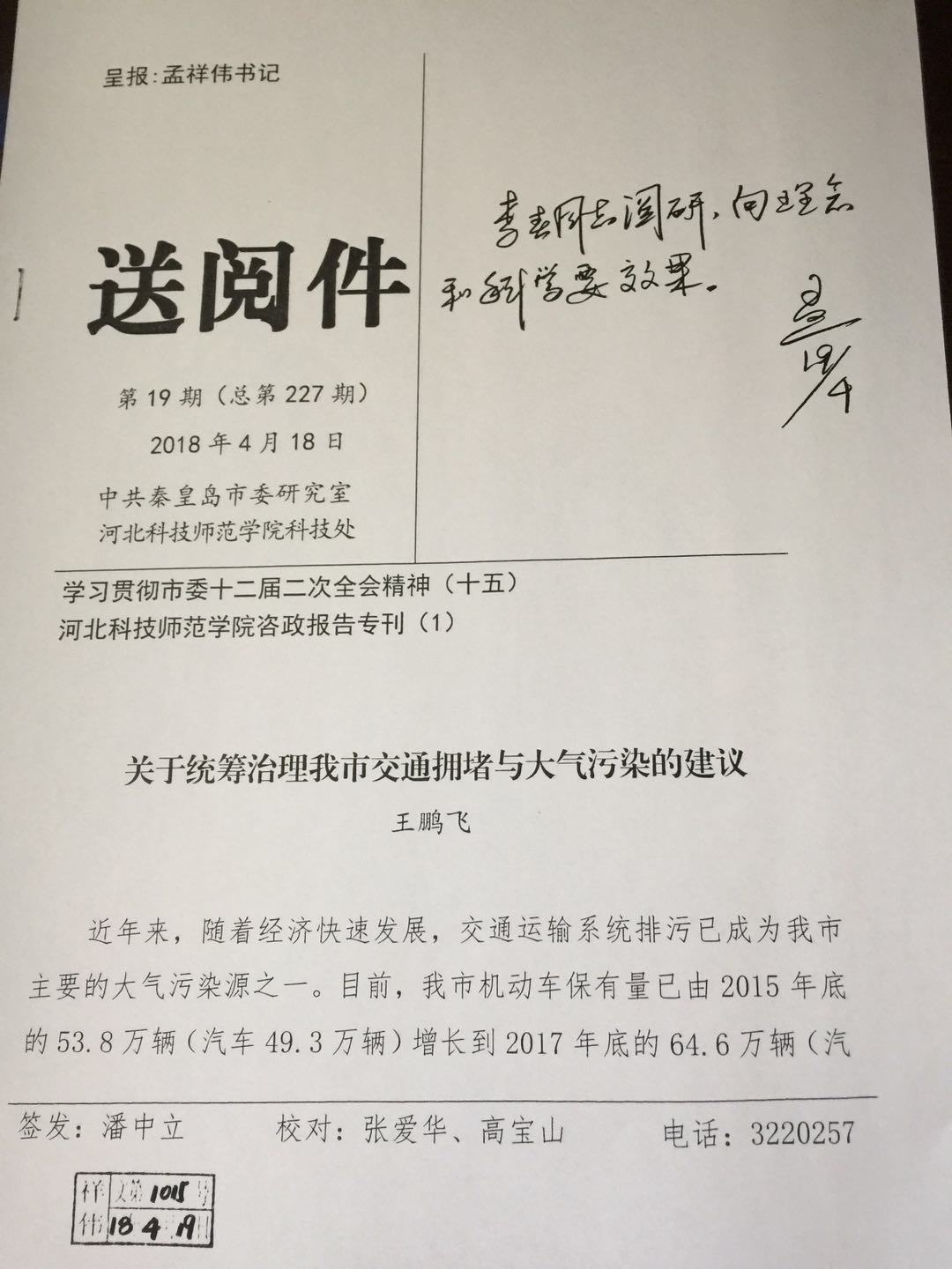 近日,市政协委员、best365城市建设学院王鹏飞博士撰写的《关于统筹治理我市交通拥堵与大气污染的建议》得到孟祥伟书记的肯定性批示。此外,近一年来,城建学院王鹏飞博士提交的多份关于秦皇岛市道路交通规划建设管理的建言献策:《关于治理我市交通拥堵问题的几点建议》、《关于治理我市交通拥堵—应从交通规划层面上加以改善的几点建议》《关于鼓励和规范我市互联网租赁自行车发展的几点建议》《关于我市暑期交通拥堵问题的分析与对策》《关于治理秦皇岛市交通拥堵问题的系列提案:现行思路与机制的改善建议》均获得孟祥伟书记、张瑞书市长、李春副市长的肯定性批示,并且部分建议已经转化落实。