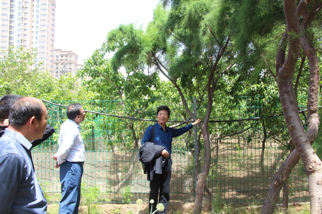 姚春江一行听取了杨俊明教授关于‘滨海翠’柽柳新品种的选育过程、品种特性以及推广示范等相关情况介绍,观看了秦皇岛电视台录制的“河北科师选育新品种,重盐碱地披绿装”新闻报道视频,实地考察了园林实验站‘滨海翠’柽柳5龄、7龄树栽培现场及其苗木繁育现状。