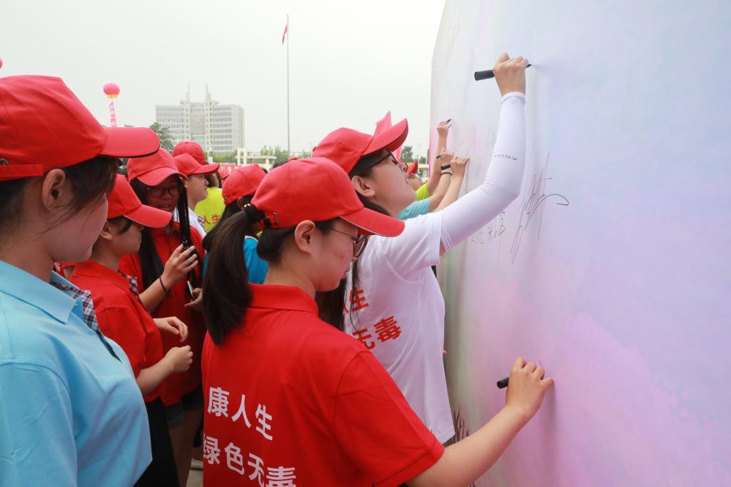 大学生禁毒志愿者纷纷在秦皇岛市626世界禁毒日宣传墙上签字