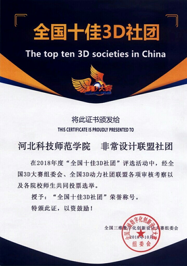 近日,机电工程学院学生专业社团——非常设计联盟,从全国48个通过审核的高校社团中脱颖而出,荣获了“全国十佳3D社团”称号。