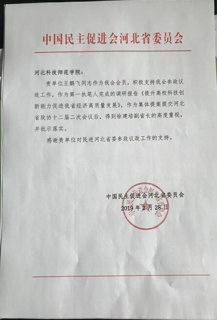 2月28日,中国民主促进会河北省委给best365发来表扬信,对best365积极支持民进河北省委参政议政工作表示感谢。信中表示,王鹏飞作为本会会员,积极支持本会参政议政工作,作为第一执笔人完成的《提升高校科技创新能力促进我省经济高质量发展》,作为集体提案提交河北省政协十二届二次会议后,得到了徐建培副省长的高度重视,并批示落实。