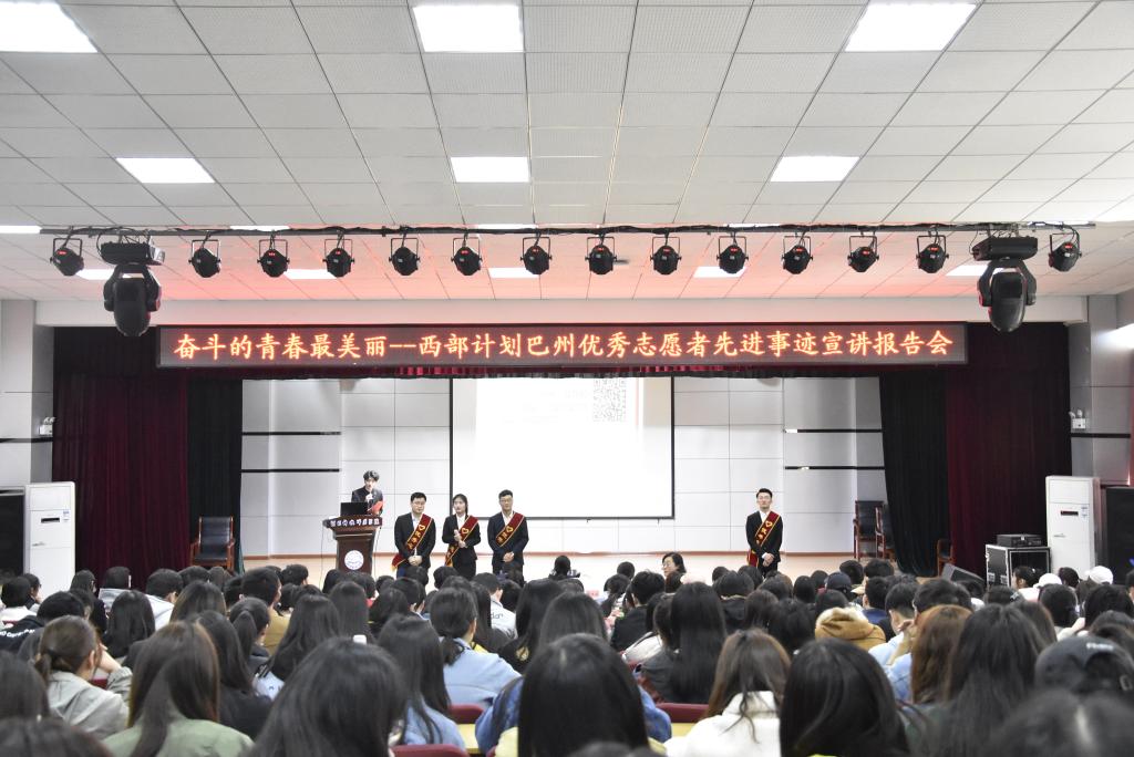 2019年3月25日,“奋斗的青春最美丽”2019年大学生志愿服务西部计划新疆巴州专项优秀志愿者先进事迹宣讲报告会在best365多功能厅举行。河北省青年志愿者行动指导中心李欣茹,巴州团委项目办负责人董岩峰出席活动,best365新疆内派教师、团委相关负责同志以及300余名学生参加活动。