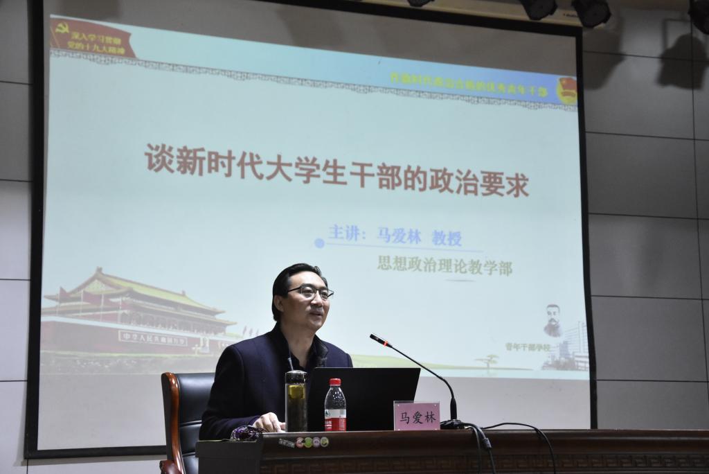 开班仪式后,思想政治理论教学部主任马爱林研究员为全体学员作了《谈新时代优秀青年干部的基本政治要求》专题讲座。讲座从时代背景出发指出当前大学生特别是学生干部提高政治素质的客观要求,并通过列举大量国内外的案例和事实,剖析了当前形势下意识形态领域问题的隐蔽性、复杂性和尖锐性,指明高校加强意识形态工作的重要性,提出大学生干部要具有高度的政治敏锐感,从而树立政治思维,增强“四个意识”,坚定“四个自信”。