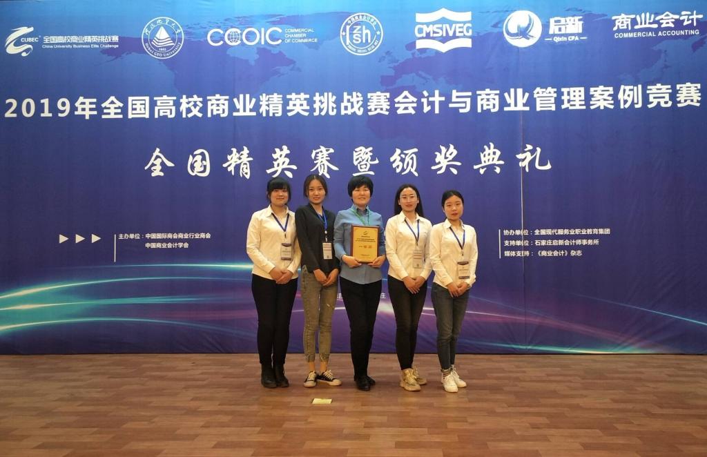 2019年4月21日,由中国国际商会商业行业商会、中国商业会计学会主办,河北地质大学承办的2019年全国高校商业精英挑战赛会计与商业管理案例竞赛全国总决赛圆满落幕。财经学院选派的参赛团队荣获团体一等奖。