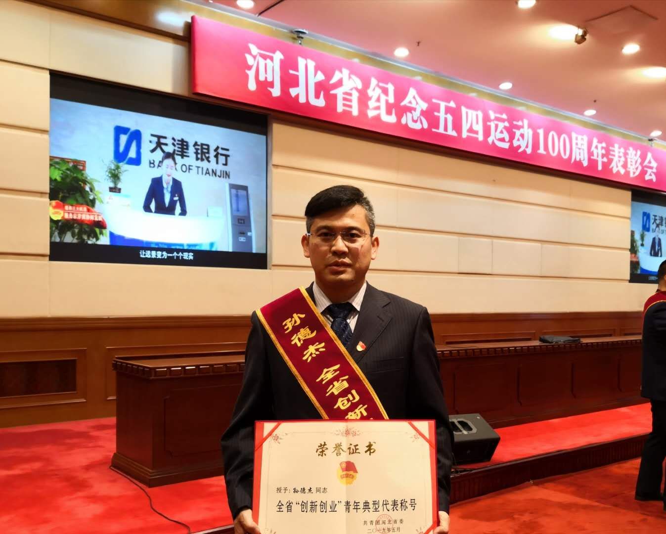 4月30日,共青团河北省委在石家庄河北会堂隆重举行河北省纪念五四运动100周年表彰大会,对以实际行动积极投身新时代全面建设经济强省、美丽河北新征程中各行各业的突出青年代表和组织给予表彰。best365数学与信息科技学院青年教师孙德杰博士被授予全省“创新创业”青年典型代表称号。全省共有五名同志获得此项称号。(编辑:孙艳敏  审核:唐代清)