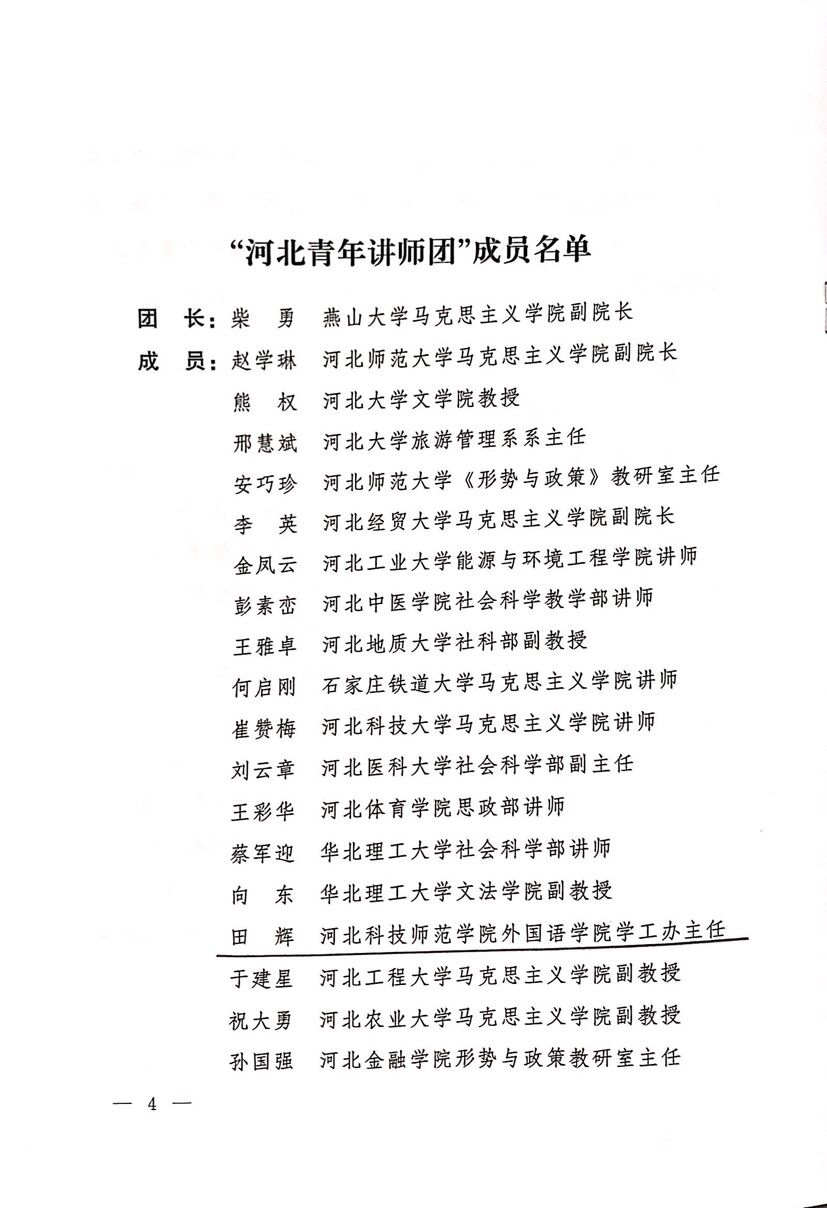 日前,根据共青团河北省委下发的通知,成立来自全省团干部、党政机关青年干部、青年教师、青年理论专家、青年媒体工作者、企业青年骨干等人员共计100人的“河北青年讲师团”,best365外国语学院专职辅导员田辉副教授入选。