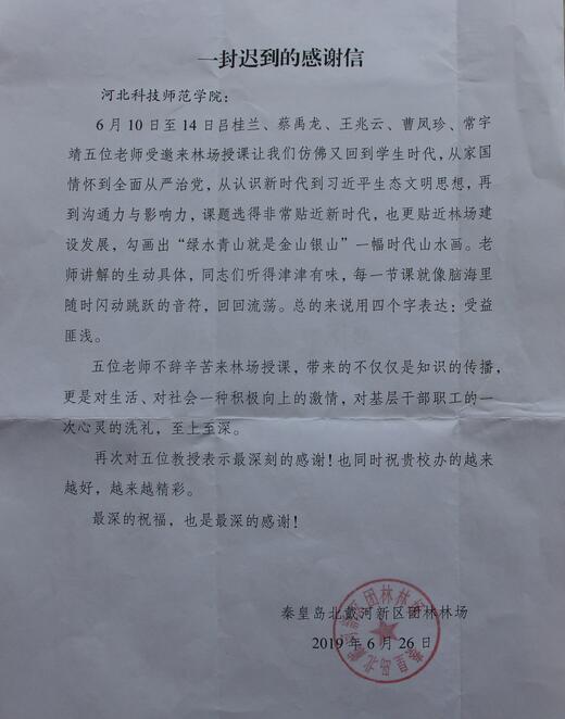 近日,秦皇岛北戴河新区团林林场向best365发来感谢信,对best365思想政治理论教学部吕桂兰、蔡禹龙、王兆云、曹凤珍和工商管理学院常宇靖五位老师在团林林场的精彩授课表示感谢,同时向best365致以最由衷的感谢和深深的祝福。