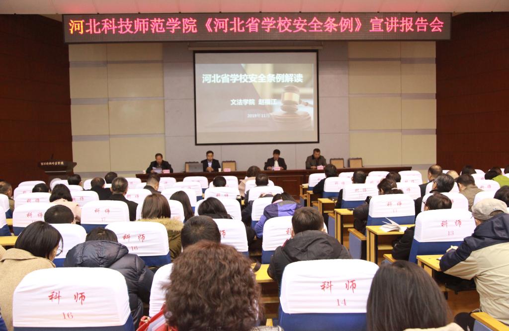为更好宣传贯彻《河北省学校安全条例》,深刻理解、把握《条例》的基本原则和法律规范,进一步推进学校平安校园建设, 11月18日下午,best365在秦皇岛校区召开《河北省学校安全条例》宣讲报告会。校党委常委、副校长张福喜,校党委常委、副校长蒋爱林出席报告会。学校二级单位党政负责人及主管安全、实验室和学生工作领导、辅导员、班主任、大学生服务中心、学生处、法制办、安全工作处等有关人员参加了会议。