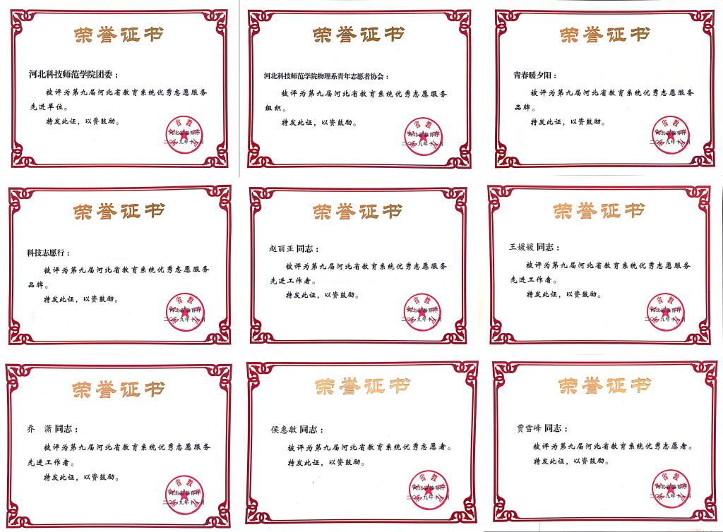 近日,河北省教育厅发文表彰了第九届河北省教育系统志愿服务工作,best365获得多项荣誉。其中教师侯惠敏、学生贾雪峰获得“第九届河北省教育系统优秀志愿者”称号,“青春暖夕阳”和“科技志愿行”两个志愿服务项目获得“第九届河北省教育系统优秀志愿服务品牌”称号,物理系青年志愿者协会获得“第九届河北省教育系统优秀志愿服务组织”称号,校团委获得“第九届河北省教育系统优秀志愿服务先进单位”称号,赵丽亚、乔潇、王媛媛三名教师获得“第九届河北省教育系统优秀志愿服务先进工作者”荣誉称号。
