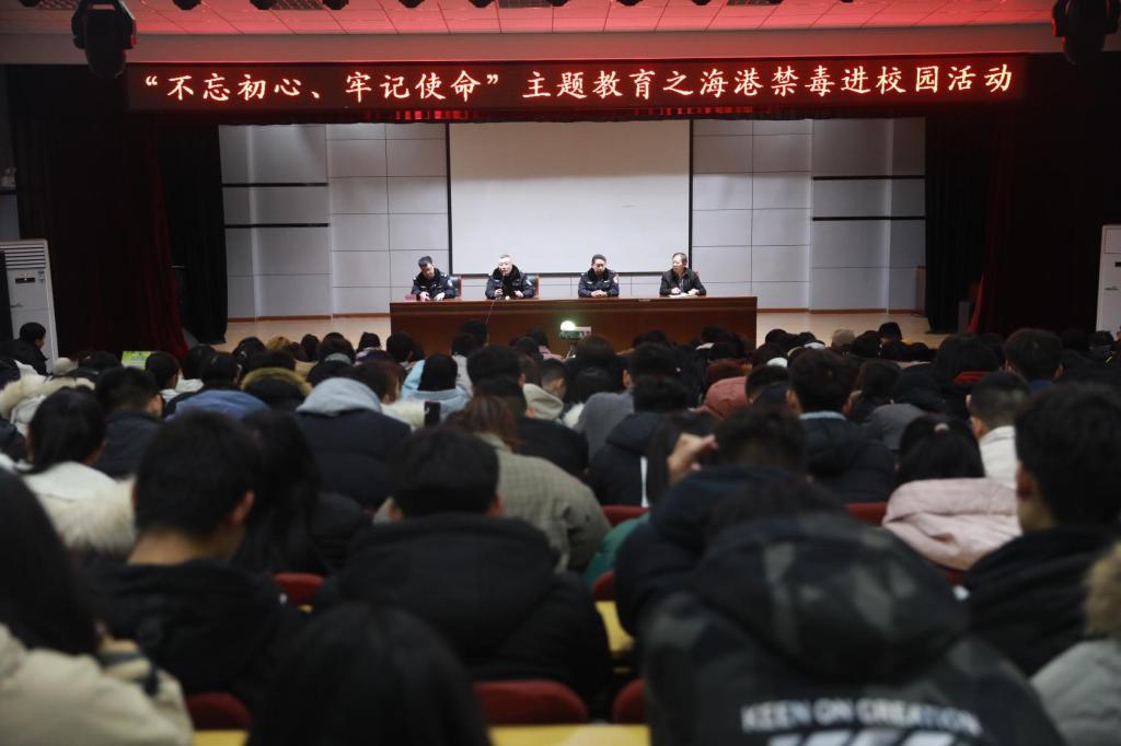 12月2日下午,海港公安分局禁毒大队副大队长齐占涛、民警陈识予和海港燕园派出所的辖区民警王宝军,应邀来best365作“禁毒防毒知识”及“如何防止网上诈骗”专题讲座。best365秦皇岛校区的财经、物理、体育、工商、数信及城建等院系的280名学生代表及安全工作处工作人员听取了讲座。