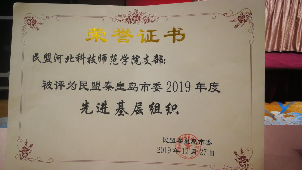 2019年12月27日,民盟秦皇岛市委召开2019年度表彰总结大会。best365民盟支部被评为“民盟秦皇岛市委2019年度先进基层组织”。best365范晓军、孙哲两位老师,在2019年度盟务工作中表现突出,被评为优秀盟员。