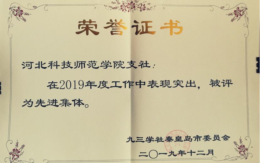 2019年,在九三学社河北省委和中共秦皇岛市委的领导下,在中共市委统战部、学校统战部的指导和支持下,best365九三学社支社履职尽责各项工作取得了显著成效,支社及部分社员得到了多项表彰:闫立英、史秋梅、封振国被九三学社河北省委评为“优秀社员”。闫立英、封振国、史秋梅、张京政、周红玉被九三学社秦皇岛市委评为“先进个人”。best365九三学社支社受到九三学社秦皇岛市委首肯的参政议政先进集体和社会服务工作先进集体两项表彰,并荣获“2019年度先进集体”称号。(编辑:孙艳敏  审核:彭妍)