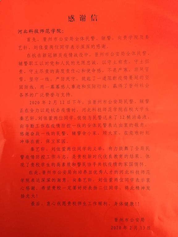 “我们不需要感谢。那么多医生、民警都能舍小家、顾大局,在危难时刻冲锋在前,我们作为大学生,也应该贡献出我们自己的微薄力量!”3月13日,学校收到来自晋州市公安局的感谢信时,她们这样说。