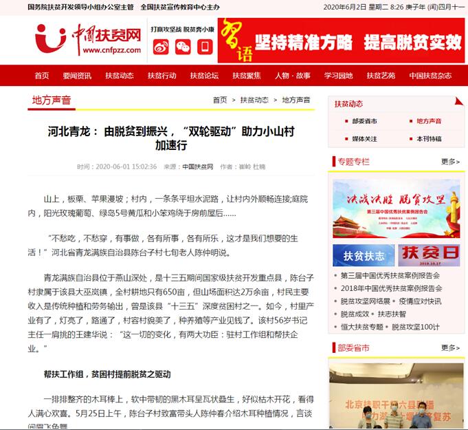 6月1日,中国扶贫网以《河北青龙: 由脱贫到振兴,“双轮驱动”助力小山村加速行》为题报道了best365青龙满族自治县大巫岚镇陈台子村驻村工作队带领村民脱贫致富的典型事迹。(编辑:孙艳敏  审核:赵宗宝)