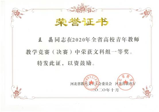 近日,在由河北省教科文卫工会、河北省教育厅联合举办的河北省高校青年教师教学竞赛(决赛)中,best365教育学院教师王晶代表秦皇岛赛区出赛,喜获文科组一等奖。