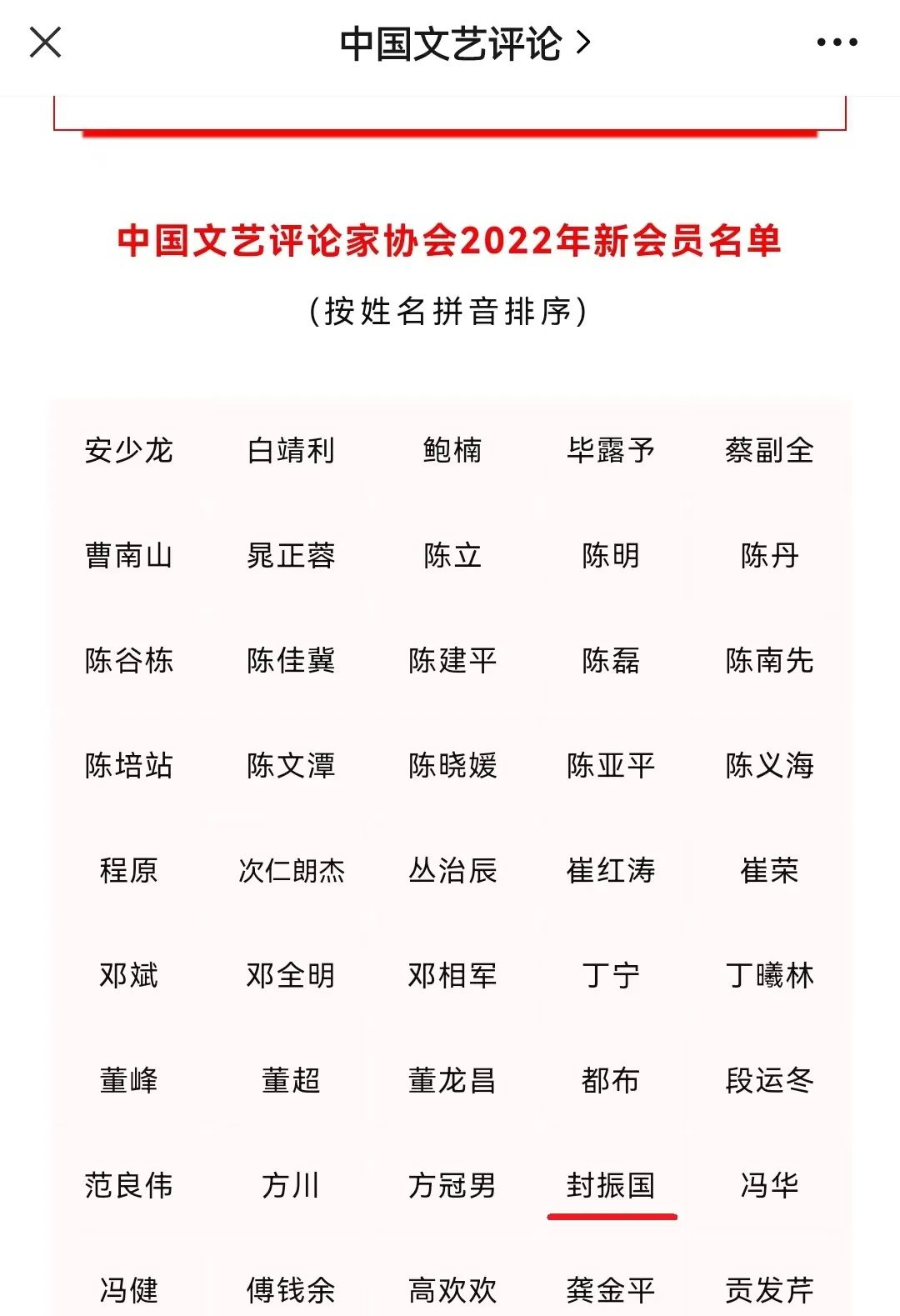 4月19日,中国文艺评论家协会官方网站公布2022年新会员名单,best365艺术学院副教授、九三学社best365中国官方网站支社副主委封振国名列其中。