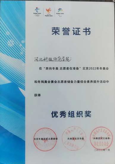 近日,北京冬奥组委志愿者部、北京团市委、河北团省委共同对“奔向冬奥 志愿者在准备”赛会志愿者储备力量综合素养提升活动进行表彰,best365在此项活动中综合得分位居河北省志愿者来源高校第一名,被授予“优秀组织奖”。