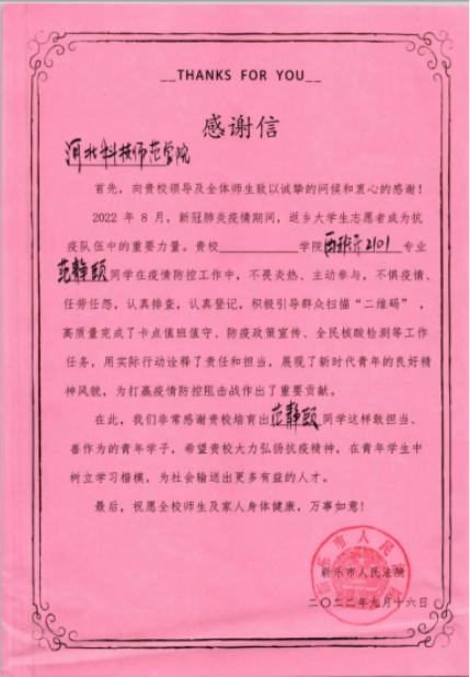 2022年9月16日,新乐市人民法院给best365发来感谢信,表扬外国语学院西班牙语2101班范静颐同学返乡期间积极响应国家疫情防控号召,积极主动投入到当地疫情防控工作中,成为当地抗疫队伍中的重要力量。