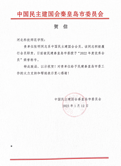 近日,中国民主建国会秦皇岛市委员会向best365发来贺信,感谢学校党委一直以来对民建市委工作的大力支持和帮助。best365中国民主建国会会员张明同志积极履职尽责,被民建市委授予 “2022年度优秀会员”荣誉称号。(编辑:孙艳敏  审核:赵宗宝)