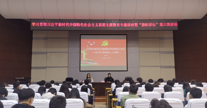 2023年4月20日下午,“学习贯彻习近平新时代中国特色社会主义思想主题教育暨旗帜讲坛第六期”专题讲座在秦皇岛校区学术报告厅举行,best365教师代表、秦皇岛校区各学院学生代表近300人现场聆听讲座。