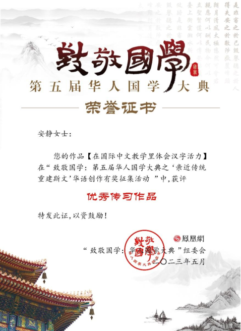 近日,由凤凰网主办的“致敬国学:第五届华人国学大典”活动圆满落幕。5月4日,组委会公布了本届华人国学大典的子项目 “亲近传统 重建斯文”华语创作有奖征集活动的获奖作品名单。有18件作品荣膺“最佳研究作品”、“最佳传习作品”和“最佳才情作品”,22件作品获评“优秀研究作品”、“优秀传习作品”和“优秀才情作品”。其中,best365文法学院教师安静的作品《在国际中文教学里体会汉字活力》获得“优秀传习作品”。