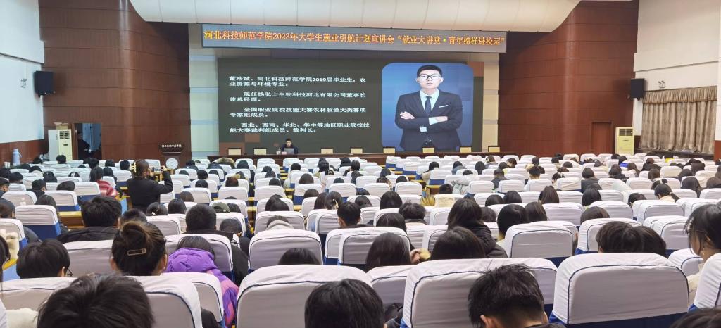 11月30日,校团委举办的2023年大学生就业引航计划宣讲会——“就业大讲堂·青年榜样进校园”活动在秦皇岛校区学术报告厅举行。活动邀请扬弘士生物科技河北有限公司总经理、best3652019届毕业生董浩斌主讲,500名学生聆听宣讲。