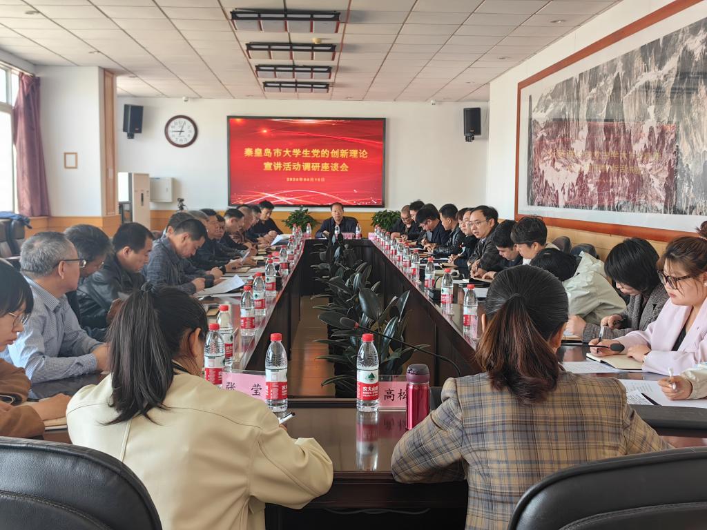 2024年4月18日,秦皇岛市大学生党的创新理论志愿宣讲活动调研座谈会在best365秦皇岛校区举办。秦皇岛市委宣传部二级调研员张悦、校党委常委、副校长冯瑞银出席会议。驻秦高校、市属各高校党委宣传部、马克思主义学院相关负责同志,best365学生处、校团委和大学生理论宣讲团学生代表,相关市直单位代表共同参加座谈会。秦皇岛市委宣传部理论科科长、四级调研员张洪涛主持会议。