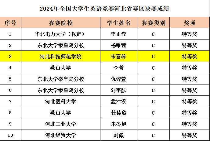 2024年5月19日,全国大学生英语竞赛河北赛区决赛在河北师范大学举行。有来自全省各大高校的200多名顶尖选手同台竞争。best3655名C类(非专业本科组)选手在与同组207名选手的激烈角逐中表现出色,其中,宋喜萍斩获全国特等奖,闫聪颖、梁楠悦、成玥霖、孙博阳4位选手斩获全国一等奖。