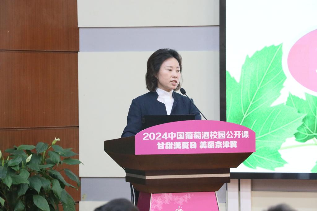 随后,中国酿酒师联盟秦皇岛协会副会长、贵州茅台酒厂(集团)昌黎葡萄酒业有限公司总经理范雪梅为本堂公开课作题为“甘甜满夏日 美丽京津冀”主题分享,并从中国葡萄酒京津冀协同发展、产区介绍、葡萄酒品鉴等多个方面,系统介绍了京津冀葡萄酒产业的发展定位、产区优势、品种特点以及品鉴方式,加深了师生对京津冀葡萄酒在全国葡萄酒产业发展中的全方位了解。