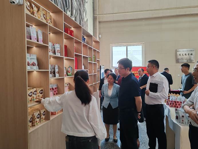 座谈会上,乡村振兴研究中心负责人介绍了学校科技成果转化、服务地方情况。调研期间,王强一行参观了科技成果转化展示和大学生创新创业项目——“科师农研”平台,板栗研究中心板栗加工产品中试车间、食品加工实验室、食品理化特性实验室、育种栽培实验室等。