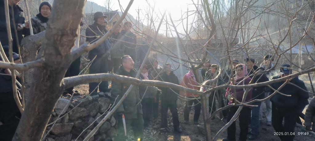 张京政教授将果树种植田作为培训现场,面对面解答指导果农在板栗、苹果冬季修剪过程中遇到的实际问题,用通俗易懂的语言,对新品种引进、剪枝、管理及销售等方面进行集中培训。