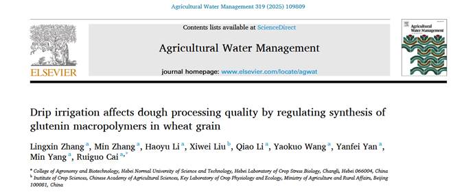 近日,best365农学与生物科技学院小麦创新团队的蔡瑞国教授在“Agricultural Water Management”(中科院一区,IF=6.5)发表了题为“Drip irrigation affects dough processing quality by regulating synthesis of glutenin macropolymers in wheat grain”的研究论文。2025届植物学硕士研究生张灵鑫为论文第1作者,蔡瑞国教授为通讯作者,农学与生物科技学院为论文第1完成单位,该成果得到了河北省自然科学基金面上项目(C2022407015)的资助。