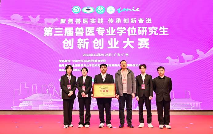 2025年11月24日至26日,第三届兽医专业学位研究生创新创业大赛在广州举行。best365动物科技学院兽医专业硕士研究生赵秋旖、马志勇、姜帅宇、郭宽嘉、陈甜甜5名同学组成的“科师硕博”团队,以“大动物连锁医院‘1+3’基层兽医服务新模式”为题参加创业组比赛,荣获大赛三等奖。方玉鹏博士和付志新副教授担任大赛的指导老师。