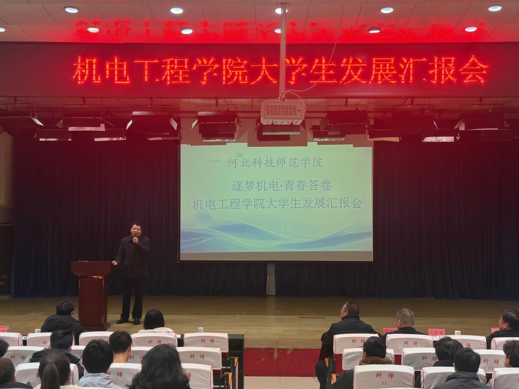 2025年12月11日,机电工程学院在开发区校区学术报告厅举办“逐梦机电·青春答卷——大学生发展汇报会”。校党委常委、副校长冯瑞银,学生处处长张红新,学院领导班子成员、辅导员、班主任、学业导师及学生代表共200余人参加了活动,部分学生家长通过线上直播“云端”观摩,共同见证机电学子在融入强国建设和民族复兴进程中的成长足迹。