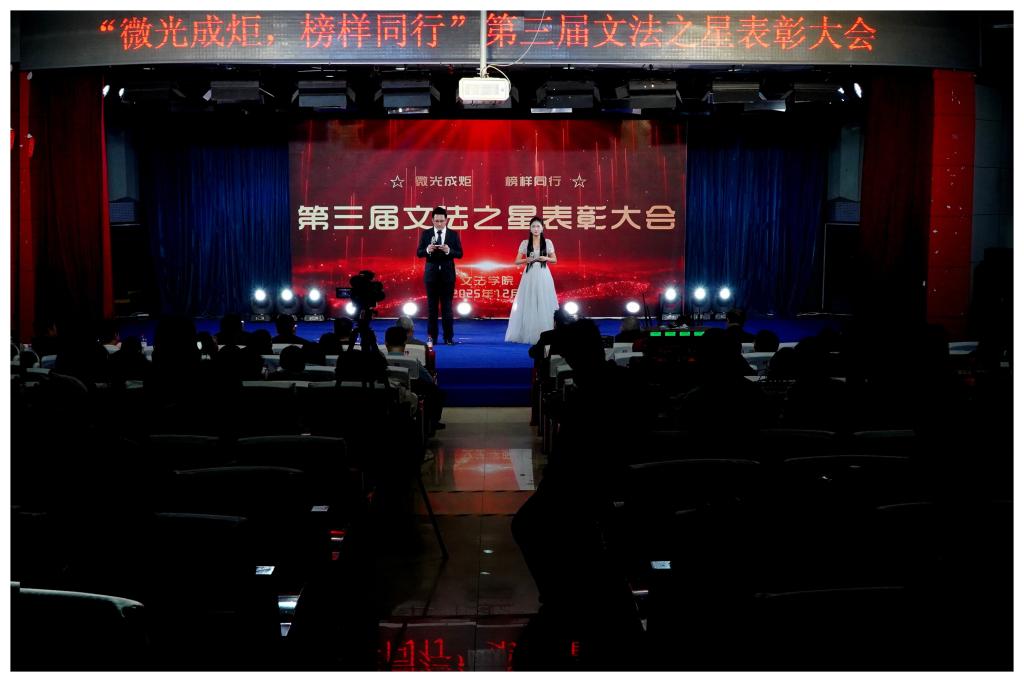 为表彰先进典型,凝聚奋进力量,2025年12月25日下午,文法学院在开发区校区综合楼报告厅举办“微光成炬,榜样同行”第三届文法之星表彰大会。校党委副书记王松出席大会并讲话。校党委宣传部、党委学工部、教务处、科研处、招生就业处、校团委、马克思主义学院负责同志出席会议。文法学院全体教师、学生代表、校友代表、家长代表千余人通过线上线下共同观看表彰会。