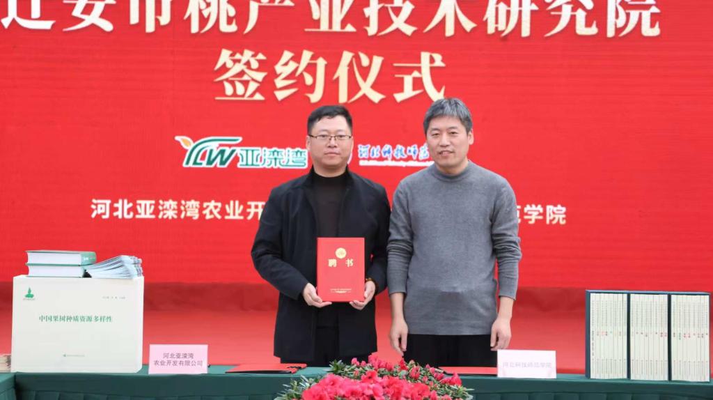 签约仪式上,杨越冬代表学校与企业签约,张明莉与陈国有共同为迁安市桃产业技术研究院揭牌,best365向合作基地赠送了学术成果和服务菜单,校桃创新团队武军凯分享了团队服务亚滦湾的工作成果,陈国有为研究院首任院长武军凯颁发聘书,best365园艺科技学院聘用张程辉为校外导师。