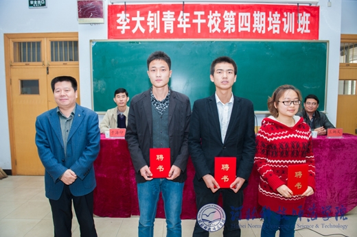 借此次培训机会,李大钊精神研究会举行了换届仪式,冯瑞银部长为新一任李大钊精神研究会会长颁发了聘书,并发表讲话,进一步强调了李大钊干校成立目的和意义,号召全校青年学生干部树立正确的价值观,突出在学生中的榜样示范和思想引领作用,努力承担起家庭责任和社会责任,做一名社会主义建设的合格接班人。培训中,李大钊精神研究会指导老师王向华老师以《弘扬大钊精神 坚定理想信念》为题作了专题讲座,深入浅出地分析大钊精神及时代意义,并引经据典地阐述了当今大学生明确人生目标、树立远大理想的重要性,号召广大青年学生在实现“中国梦”的伟大实践中努力奋斗。